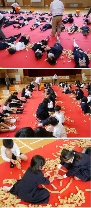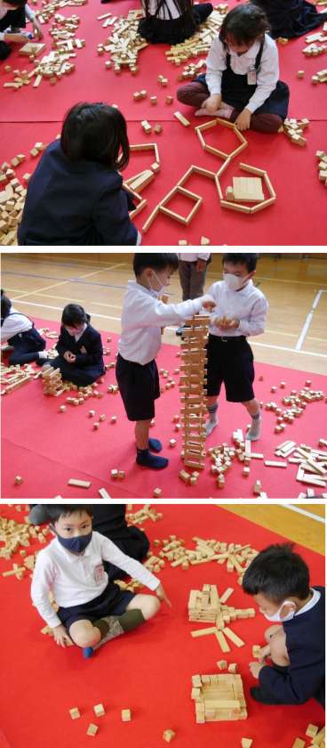 1年生は、出前授業にきていただき、体育館でとてもたくさんの積み木で楽しみました。最初は積み木のシャワーの中に入りこみ、自分たちで積み木を並べていきした。とても楽しそうです。