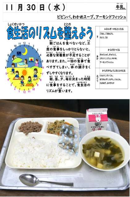 今日の献立は、ビビンバ、わかめスープ、アーモンドフィッシュ、牛乳でした。