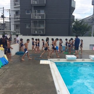 中学年、3.4年生の開放が始まります。みんな早く入りたくて、うずうずしています。元気な声で体操しています。