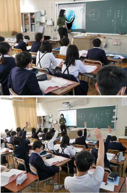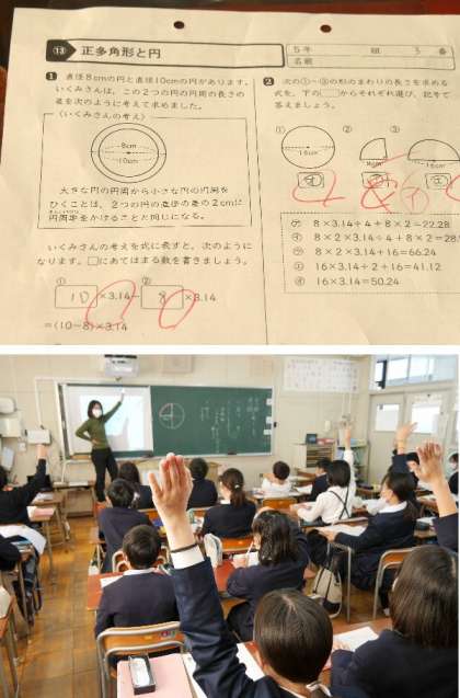 5年生の算数では、円について学習を進めています。子どもたちはしっかり手をあげて発表し、積極的に授業に参加してがんばっています。