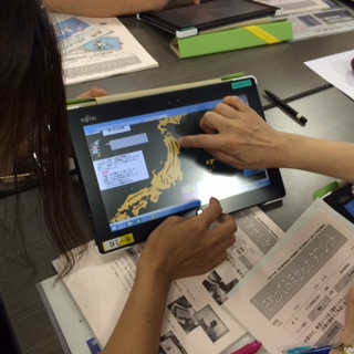 100人以上の先生が、本校に集まってICTを使った授業研修を行っています。講師は、全員『ひがみや』の先生です。本校での授業実践を、他校の先生方が真剣に学んでいます。