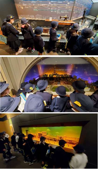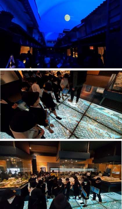 今昔館の館内が雷鳴がなったり、夕方になり夜になってお月さまがでています。夜の町も体験しました。移動して、明治から昭和の町並みも見学しました。氷冷蔵庫などの昔の家電もたくさんあります。