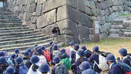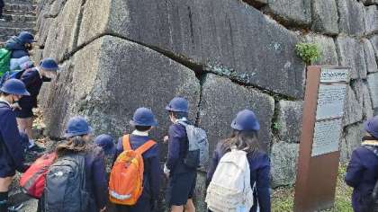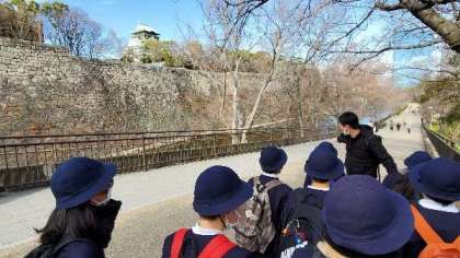 ピースおおさかをあとにして、大阪城にある石垣の機銃掃射痕を見学しました。