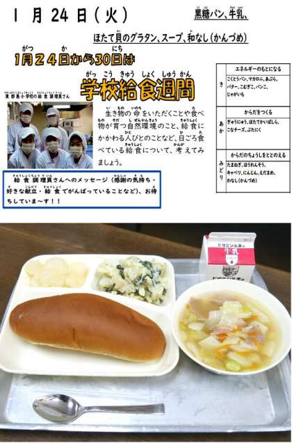 1月24日 今日の給食は! 公開日 2023/01/24 更新日 2023/01/24 学校生活 今日の献立は、ほたて貝のグラタン、スープ、和なし(缶)、黒糖パン、牛乳でした。おかわりもたくさんして、残食は少ないです。 いいね(0)