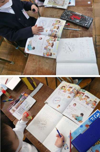 1年生では、時計の針の読みかたを学習しています。「何時何分」かな。