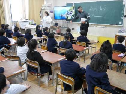 1年生にクリス先生が英語活動にきてくれました。今日は「What's this?」です。さて、これは何でしょうか。
