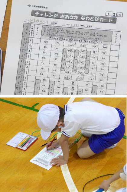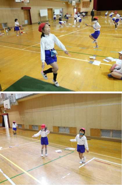 1年生がなわとびの練習をしています。いろいろなとび方にチャレンジしながら、なわとびカードにできたことを書いていきます。交差とび、2重とびなど、がんばっています。