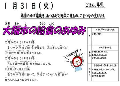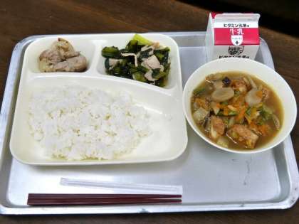 今日の献立は、鶏肉のゆず塩焼き、あつあげと野菜の煮物、小松菜の煮びたし、ごはん、牛乳でした。