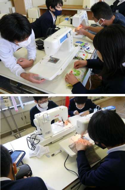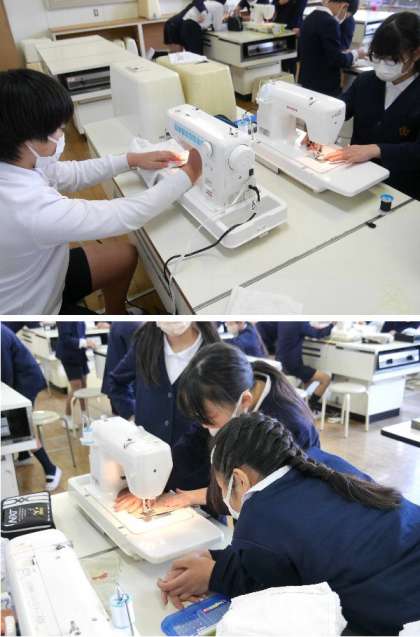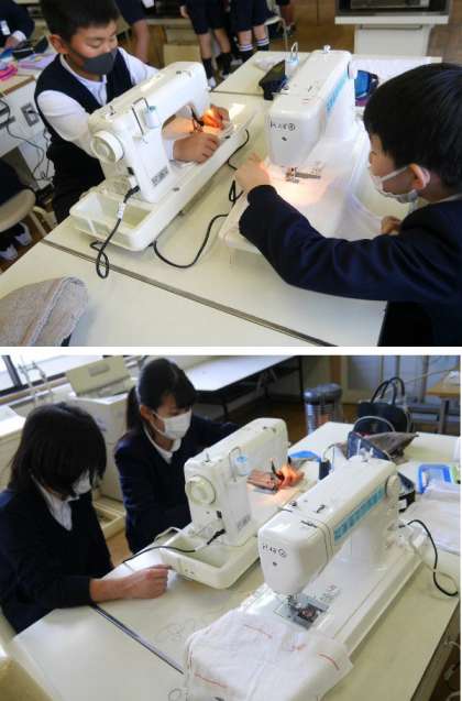 6年生が家庭科室でぞうきんをミシンでつくっています。卒業をひかえ、在校生に感謝の気持ちをこめて、贈呈するぞうきんを手作りで作っています。ミシンの操作にも慣れていますね。