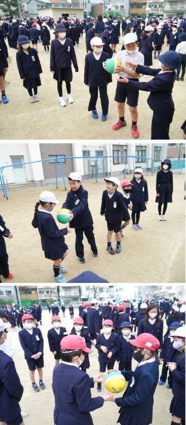 今日のたてわり児童集会は、ばくだんゲームをしました。各たてわり班で、ボールを持って、音楽の鳴っている間につぎつぎと回していきます。音楽が鳴りやんだときに持っていた人が負けです。その場で一周まわる罰をうけます。