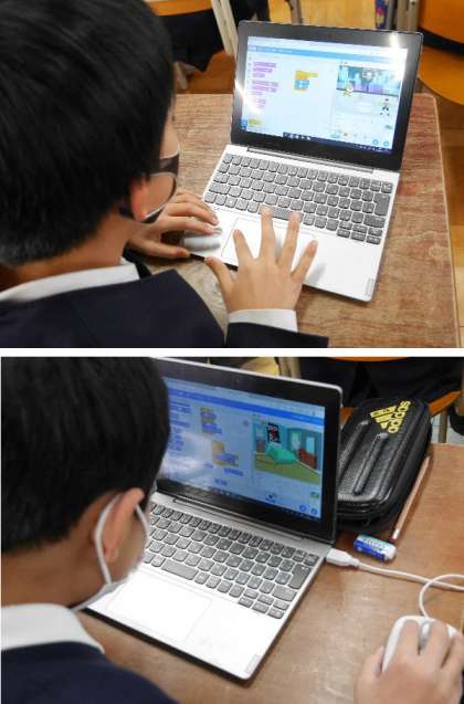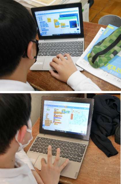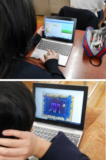 6年生では、パソコンを使って、スクラッチというビジュアル系のアプリを使って、プログラミングを実践していました。