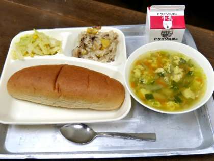 今日の献立は、中華おこわ、卵スープ、キャベツのオイスターソースいため、黒糖パン、牛乳でした。