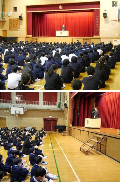 全校朝会がありました。校長先生からは、きびしい冬のあとに、かならずあたたかい春がきるよとお話しました。