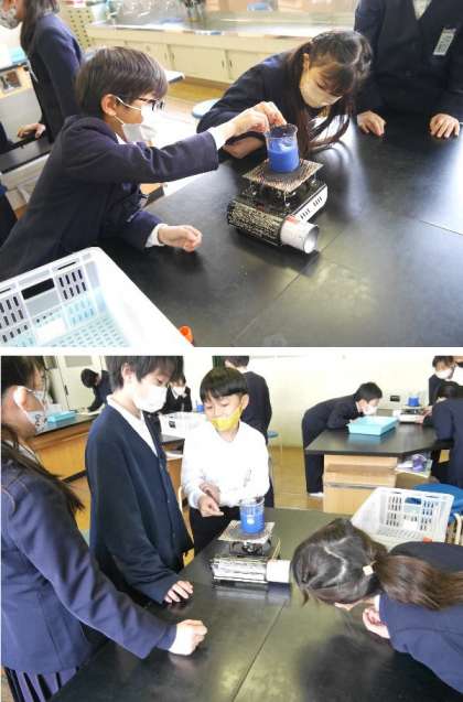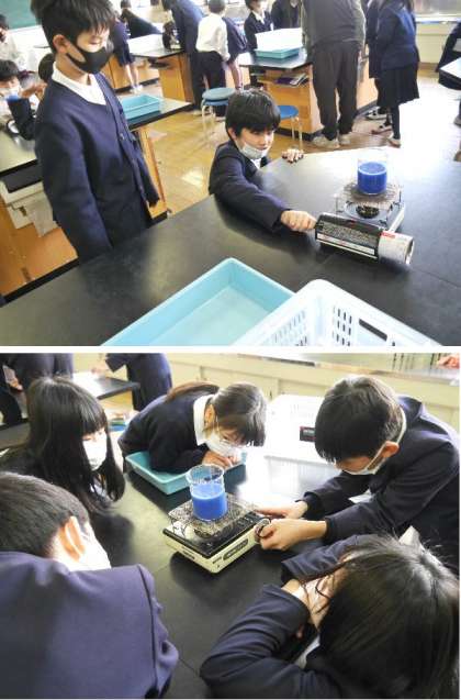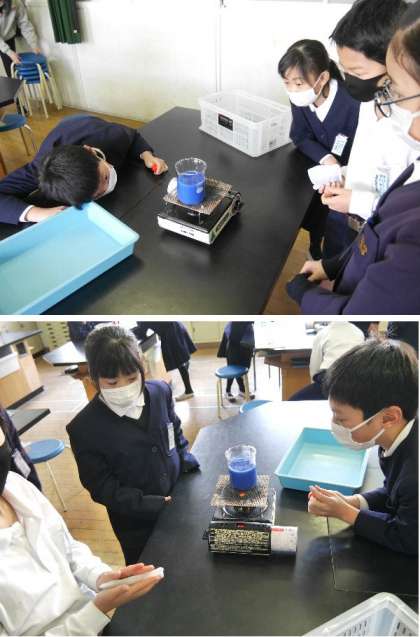 4年生が理科室で実験をしています。わかりやすいように色つきの水をコンロであたためています。どのように全体にあたたまっていくのかを観察して調べました。