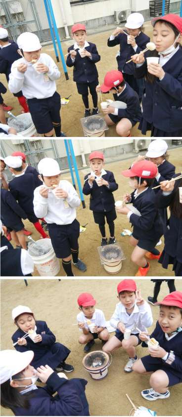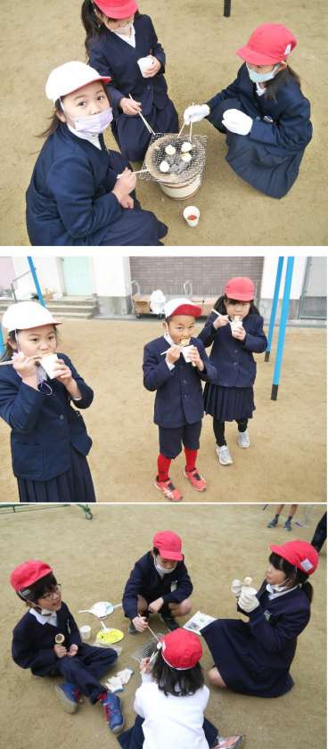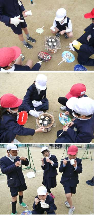 3年生は、昔の生活体験として七輪を体験しています。炭をおこして、網をのせて、おもちを焼きました。できあがった焼きもちを、おしょうゆにつけていただきました。焼きたてはおいしいですね。