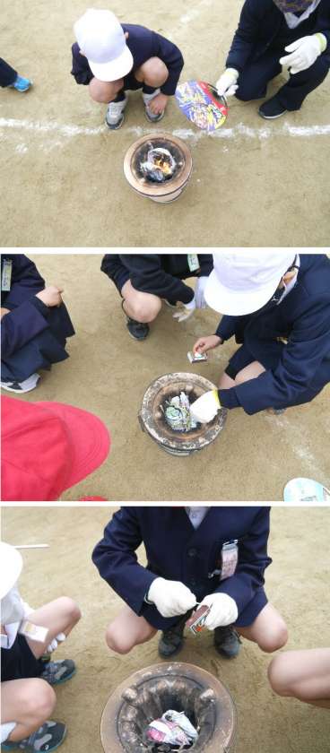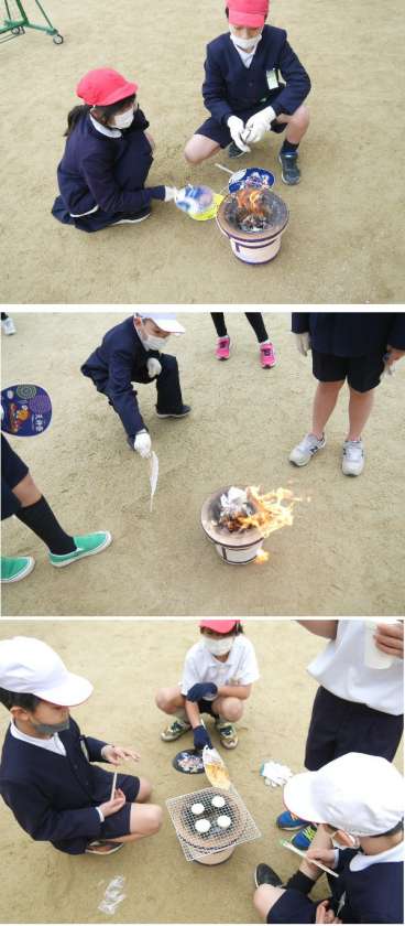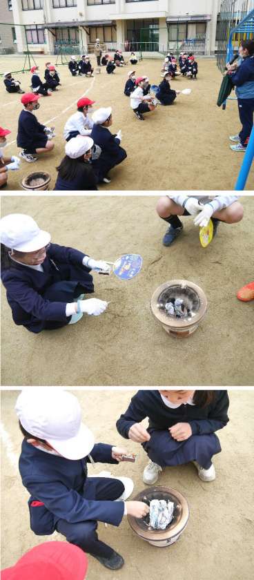 3年生は、昔の生活の体験として、七輪をつかう体験をしました。炭をいれて、新聞紙をくべて、マッチで火をつけます。おそるおそるに火をつけていました。なかかな、炭に火がつかなくて、何度も何度も火をつけなおしました。けっこうむずかしいですね。