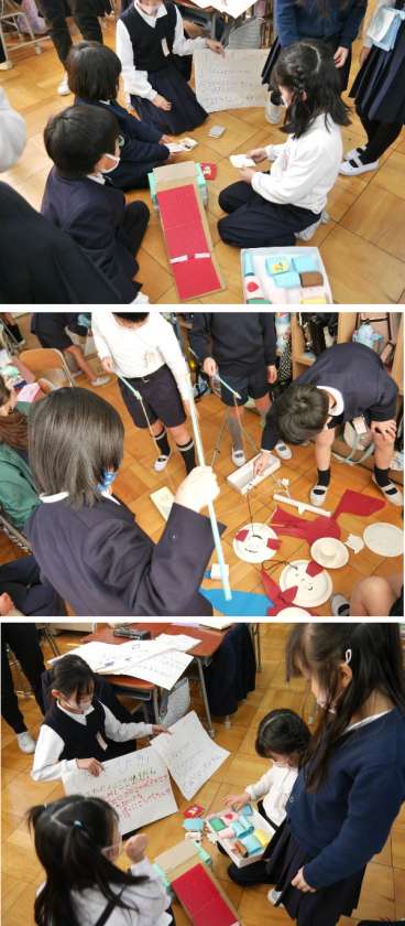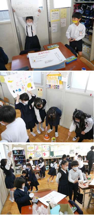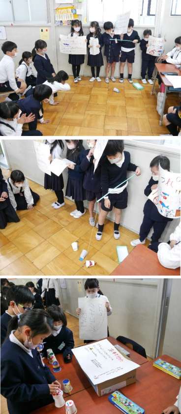 2年生では、もちよった空き箱などを使って、おもちゃをつくってきました。今日は、その発表会をして皆で作ったおもちゃで遊んで楽しみました。グループで作ったおもちゃを、作った説明文などで説明して、遊び方を説明しました。発表後にみんなで遊びました。