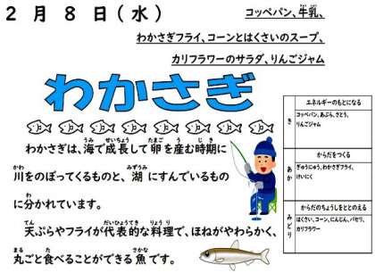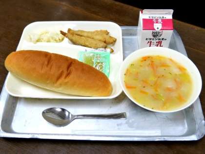今日の献立は、わかさぎフライ、コーンとはくさいのスープ、カリフラワーのサラダ、りんごジャム、コッペパン、牛乳でした。