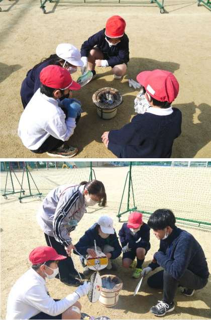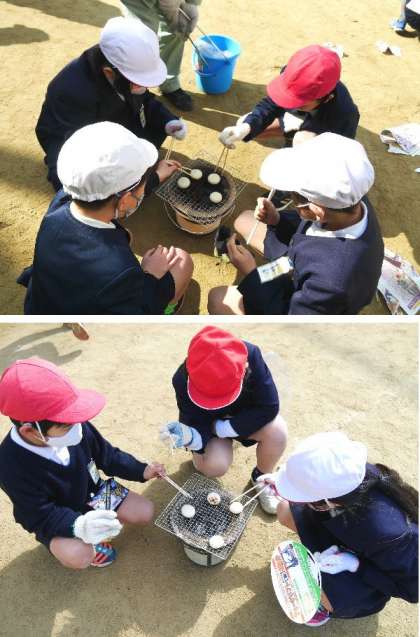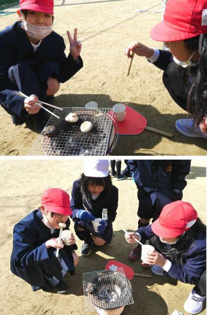 3年生の七輪体験です。上手に炭に火をつけることができ、おいしくおもちを焼くことができました。焼きたてはおいしいですね。