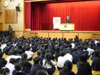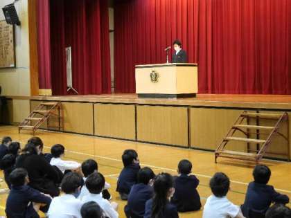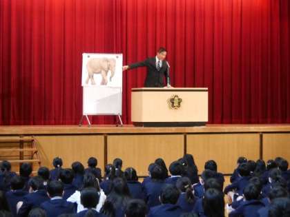 全校朝会を行いました。校長先生からは、「暗い部屋の中の象」についてお話しました。