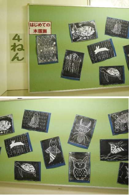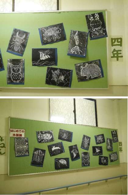4年生の掲示板に、はじめての木版画の作品が掲示されました。