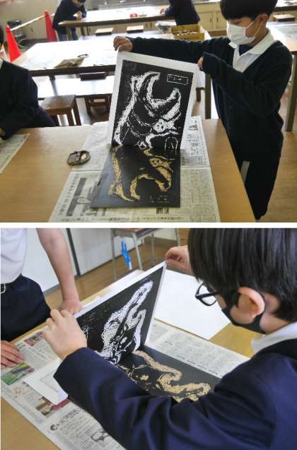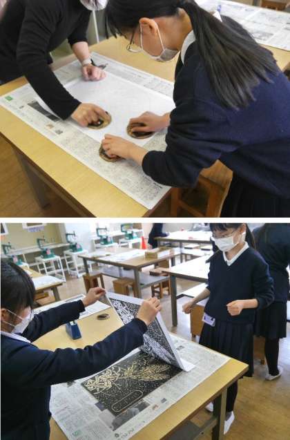 5年生では、彫刻刀でほった版画にインクをつけて刷っていました。きれいに印刷できていますね。