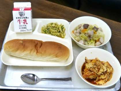 今日の献立は、ポトフ、カレーソテー、焼きプリン、レーズンパン、牛乳でした。
