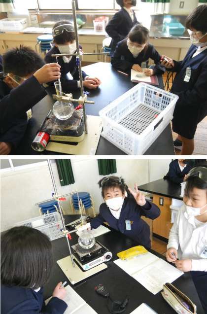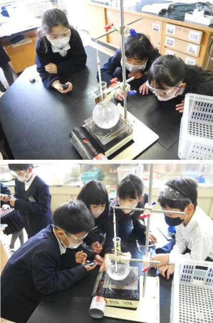 4年生が理科室で実験をしています。フラスコに水を入れてコンロで温めています。フラスコの温度計の温度を、2分経過するごとに測って記録していました。何がわかったのかな。