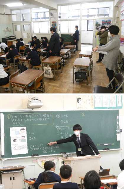 3年生の算数で研究授業が行われました。場面の設定で、わからない数を四角にして式を考えていきます。