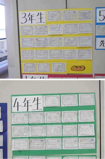 給食室の前には、全校児童からの給食調理員さんへの感謝のメッセージが貼られています。「いつもおいしい給食ありがとうございます。」