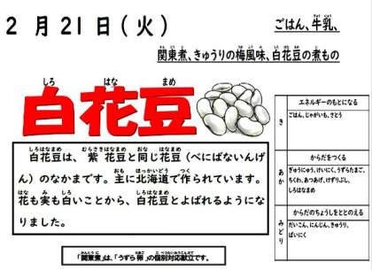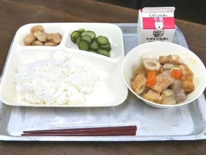 今日の献立は、関東煮、きゅうりの梅風味、白花豆の煮もの、ごはん、牛乳でした。