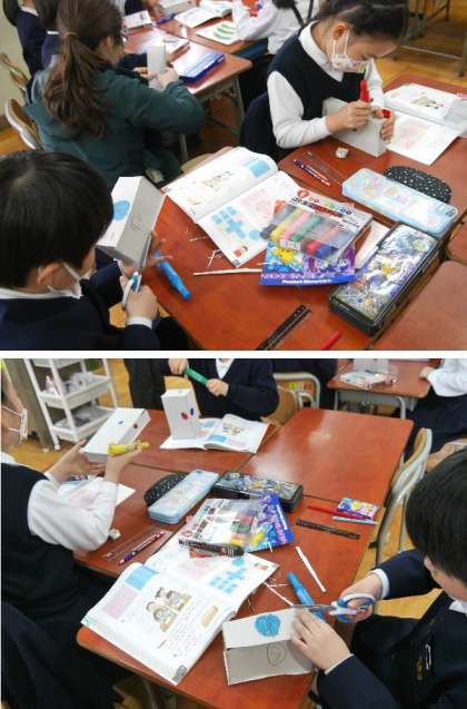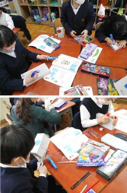 2年生の算数では、面を6つつなげて箱をつくって、立体づくりを学習していました。