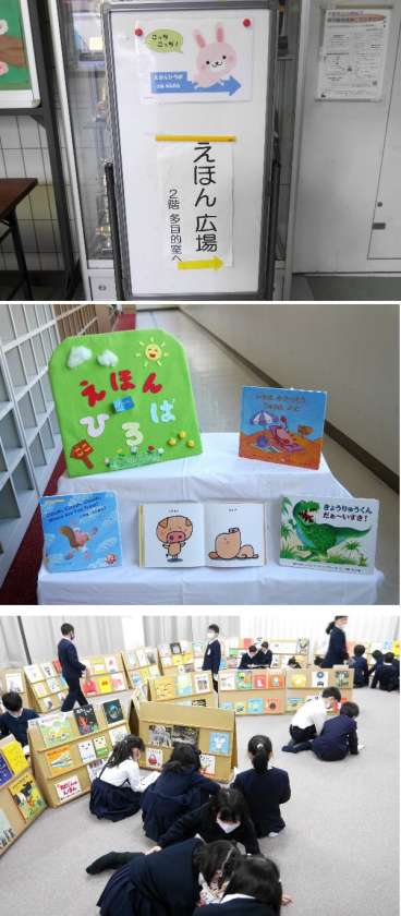 昨日、多目的室で準備していただいた「えほん広場」が、今日から始まります。各学級ごとに、図書の時間に多目的で、いろんな絵本を自由に楽しみました。