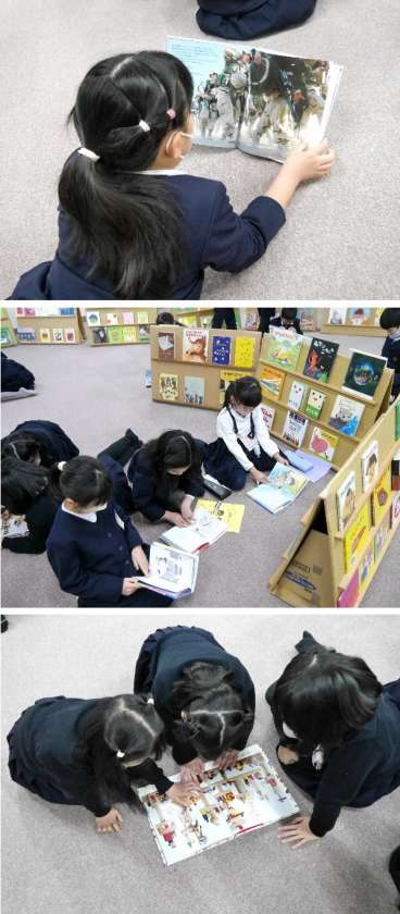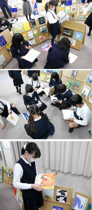 また、20分休み時間や、お昼休みの時間には、ひまわりさんやPTAの方がみてくださって、絵本を読むことができます。