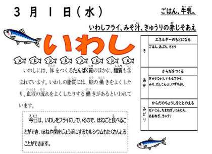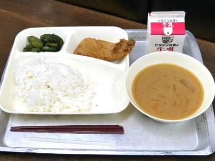 今日の献立は、いわしフライ、みそ汁、きゅうりの赤じそあえ、ごはん、牛乳でした。