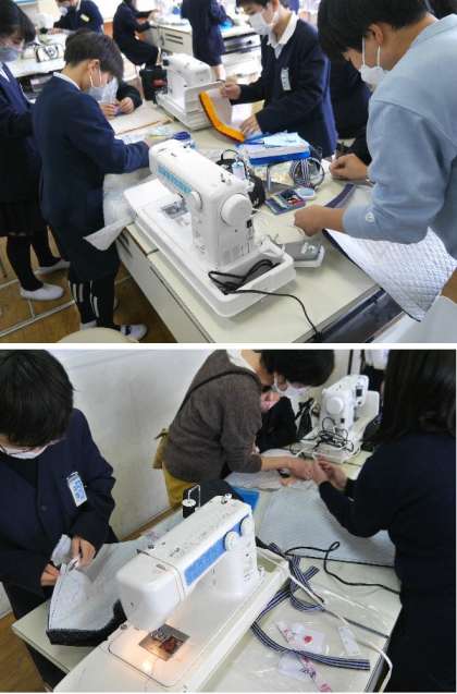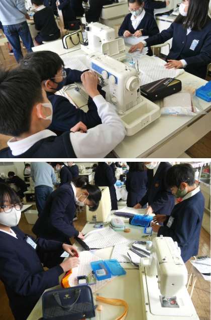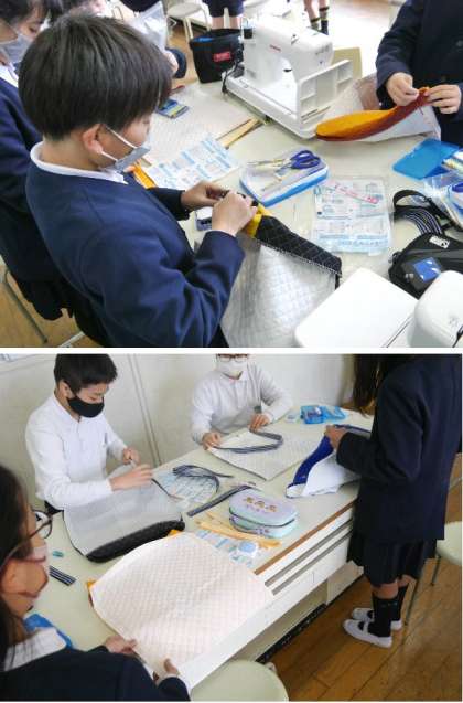 5年生の家庭科では、トートバックを作っています。今日のミシンがけは、いよいよ袋状に縫っていきます。もうすぐ完成ですね。