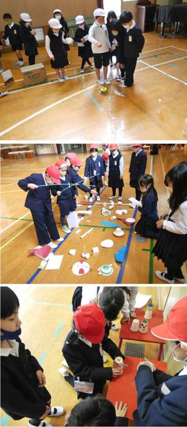 2年生が作った手作りおもちゃで、1年生のために「おもちゃ広場」を開催してくれました。1年生は、2年生が作ったおもちゃの使い方の説明を聞いて、楽しんでいました。