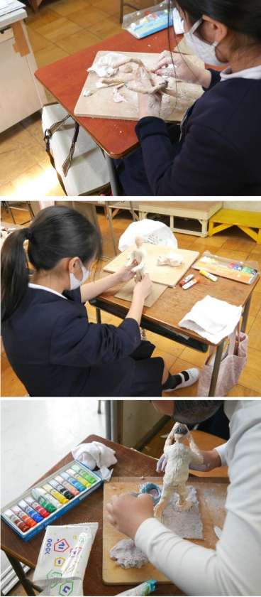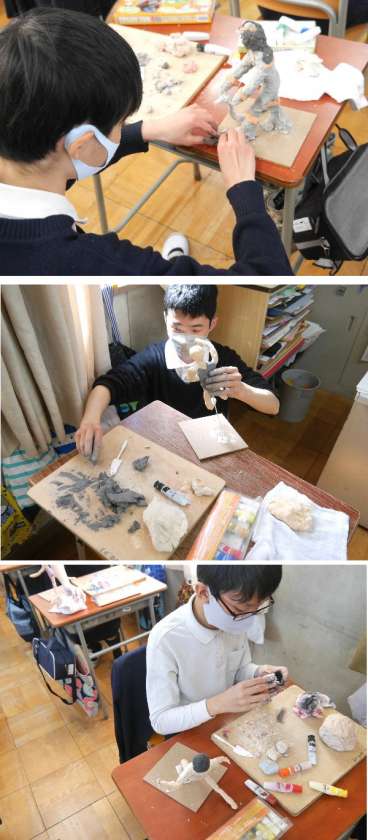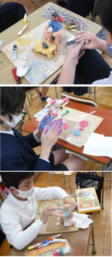 6年生の最後の図工作品です。人形の芯に紙粘土で、将来の自分の夢、なりたい自分の姿を作っていました。