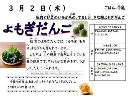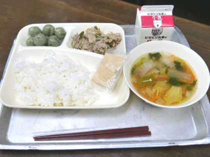 今日の献立は、豚肉と野菜のいためもの、すまし汁、きな粉よもぎだんご、ごはん、牛乳でした。