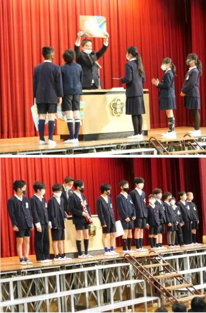今日の全校朝会では、平和ポスターの表彰をおこないました。また、男子ミニバスケットボールの表彰も行いました。