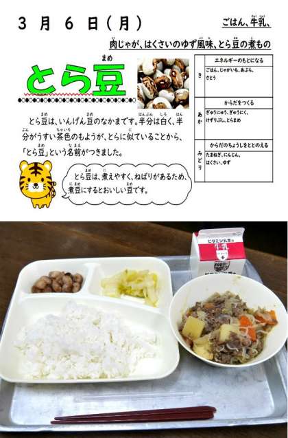 今日の献立は、肉じゃが、はくさいのゆず風味、とら豆の煮もの、ごはん、牛乳でした。