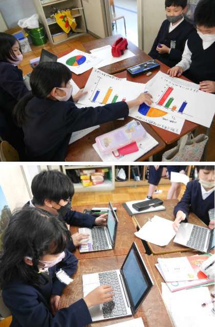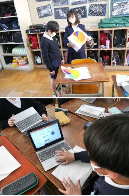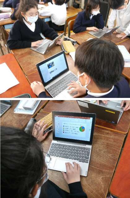 4年生の国語では、学級でアンケートをとって調べた結果をまとめる学習をしていました。円グラフなどをパワーポイントで分かりやすく説明する資料を作っていました。パソコンの操作もとても慣れていてスムーズに使っています。