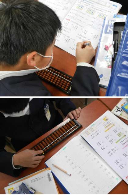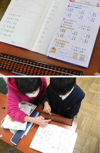 3年生の算数の最後です。そろばんを使って計算練習をしています。繰り上がりや繰り下がりがあると、計算がむずかしいですね。そろばんなら、簡単な考えでできるんですよ。