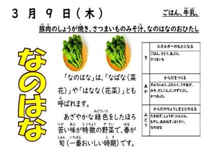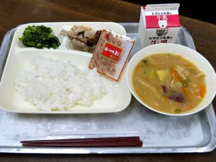 今日の献立は、豚肉のしょうが焼き、さつまいものみそ汁、菜の花のおひたし、ごはん、牛乳でした。