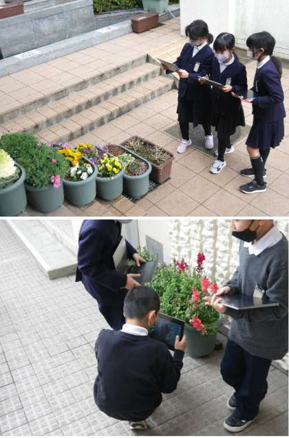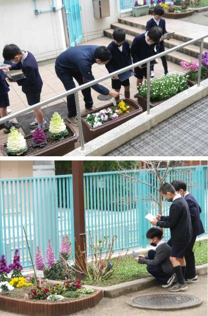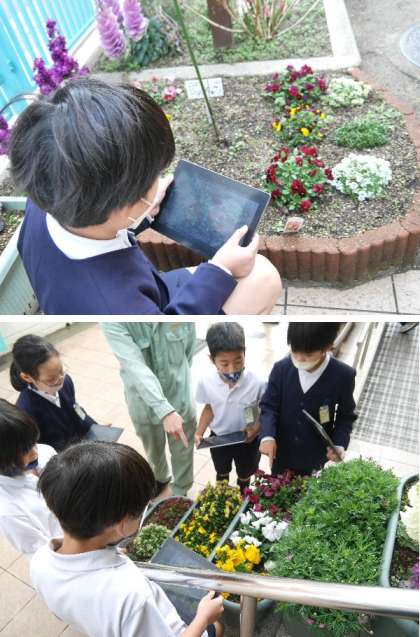 3年生が玄関の花壇を観察して、タブレットで写真を撮ったりしています。春にむけた花々がきれいに咲いていますね。