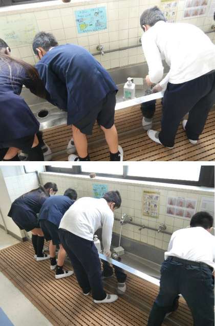 6年生が各階の洗面所をていねいに隅々まで掃除を