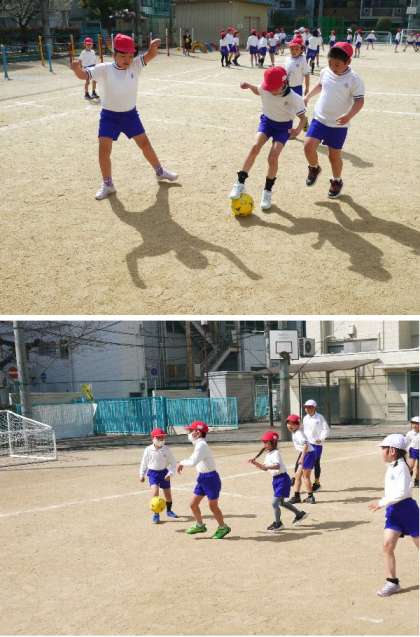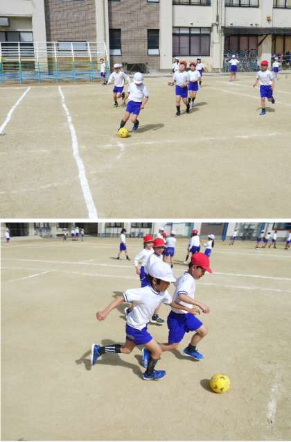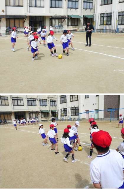 2年生がサッカーボールで白熱しています。チームに分かれての対戦では、しっかりルールを知って楽しんでいました。