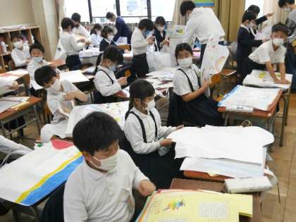 作ったり描いたりした作品を作品袋に入れて持ち帰ります。この1年間のあしあとですね。