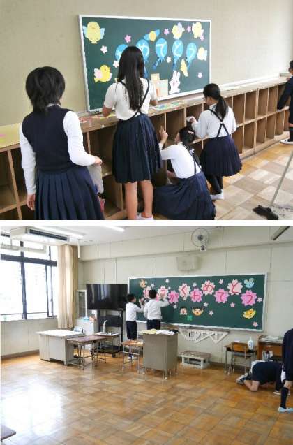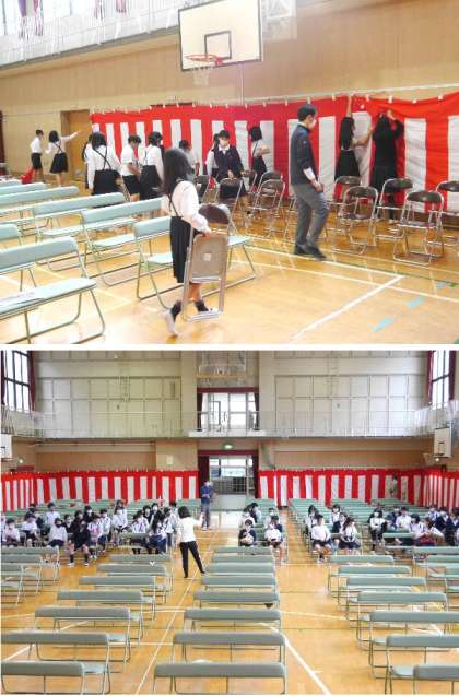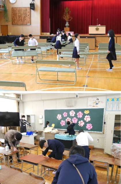 新6年生が登校してくれて、入学式の会場準備を行いました。