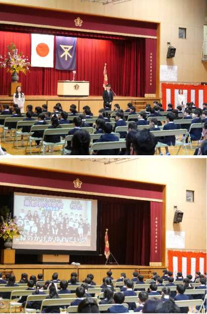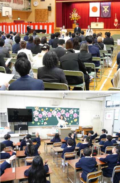 入学式では、担任の先生の紹介があり、新2年生からの歓迎のビデオメッセージと校歌を披露してくれました。